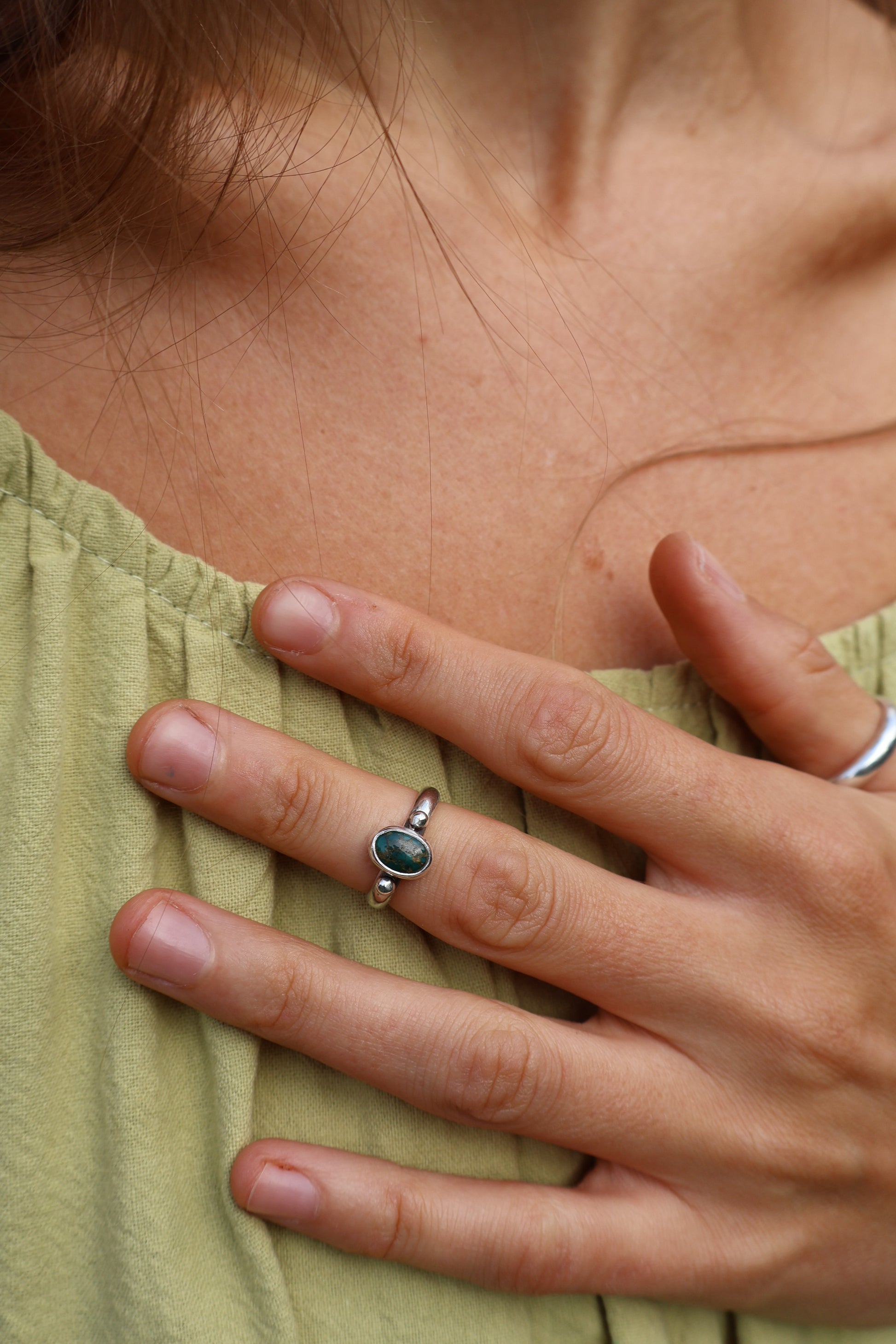 this beautiful little turquoise midi ring is the perfect staple to adding a little bit of earthy uniqueness to your collection. you can wear it on your little finger or add it to your earthy stacking set by wearing it on your midi.